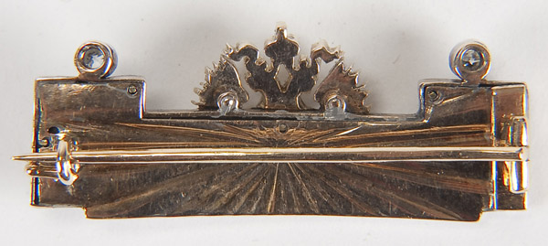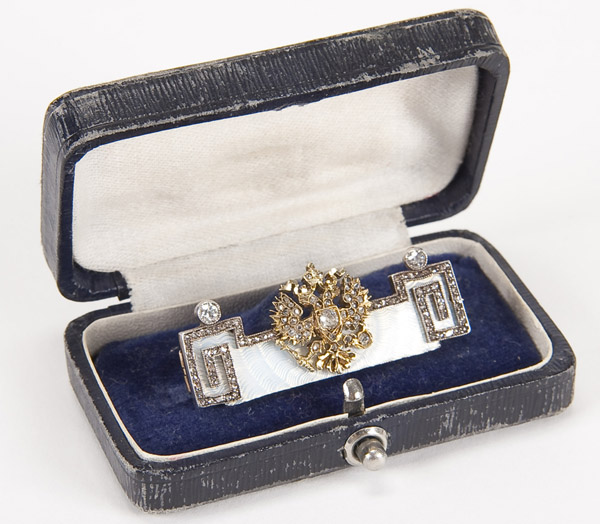 AN IMPERIAL RUSSIAN GOLD, DIAMOND AND GUILLOCHE ENAMEL BROOCH, 19TH CENTURY. The rectangular form with white translucent enamel over a wavy engine turned ground and set with a gold double-headed eagle encrusted with diamonds and the panel futher bordered with diamond set banding. Pin back in vintage fitted case. Apparently unmarked. Length 1.5 inches (4 cm).