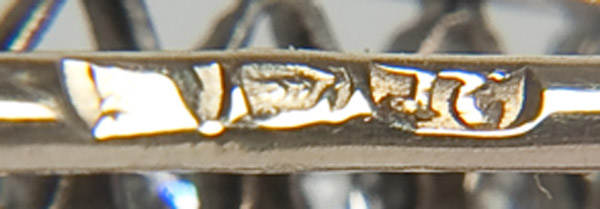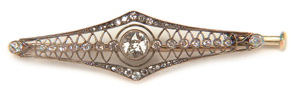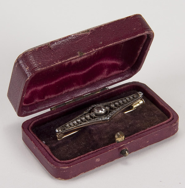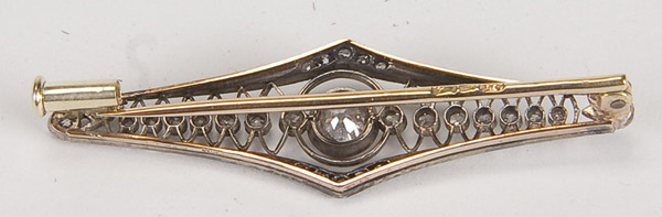 A FINE RUSSIAN GOLD AND DIAMOND FILIGREE BROOCH, 19TH CENTURY. At center an approx. 1/2 carat diamond, flanked by 16 smaller diamonds on either side and a dozen more at top and bottom. Hallmarked Moscow, 56 gold standard and indistinct maker's mark. Length 1.75 inches (4.5 cm). With vintage filtted case.