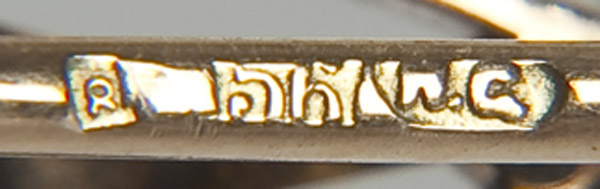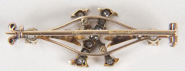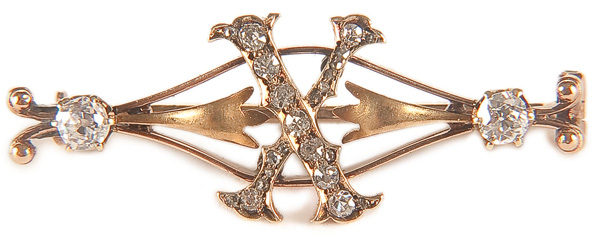 A RUSSIAN GOLD & DIAMOND 10TH ANNIVERSARY BROOCH, CIRCA 1900. Of ribbon form with the Roman numeral X containing 19 diamonds of various size, the largest approx. 1/8 ct. Hallmarked St. Petersburg and 56 gold standard and indistinct Cyrillic maker's mark. Length 1.5 inches (4 cm).