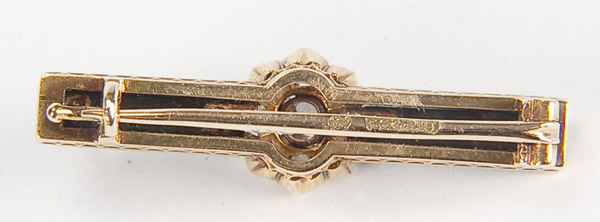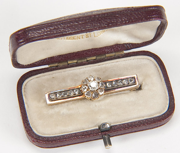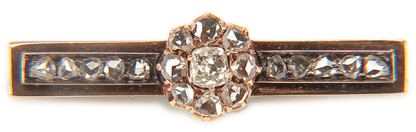 A RUSSIAN GOLD & DIAMOND BAR PIN, CIRCA 1900. With a rosette of single and rose cut diamonds, the largest approx. 3 mm in diameter. Flanked by two columns of 5 rose cut diamonds. Hallmarked Moscow, 56 gold standard, and Cyrillic maker's mark P.O. Contained in a period London jewelers box. Length 1.25 inches (3.5 cm).