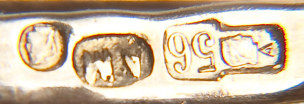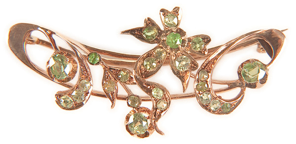 A RUSSIAN GOLD AND EMERALD BROOCH, CIRCA 1900. Of scrolled foliate form containing 24 single and rose cut demantoids. Hallmarked Moscow, 56 gold standard, and Cyrillic maker's mark A.M. Length 1.75 inches (4.5 cm).