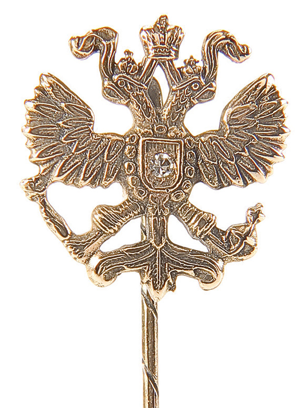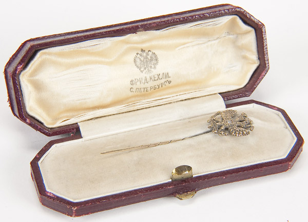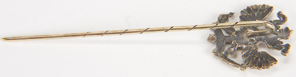 A FINE RUSSIAN GOLD AND DIAMOND IMPERIAL EAGLE STICK PIN. Imperial double-headed eagle, apparently unmarked, with fitted case and maker's stamp Fred Koechli - St. Petersburg.