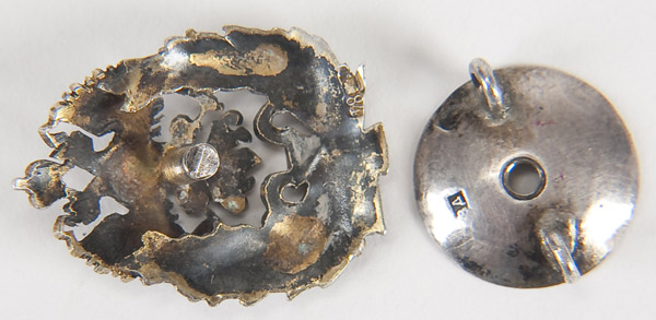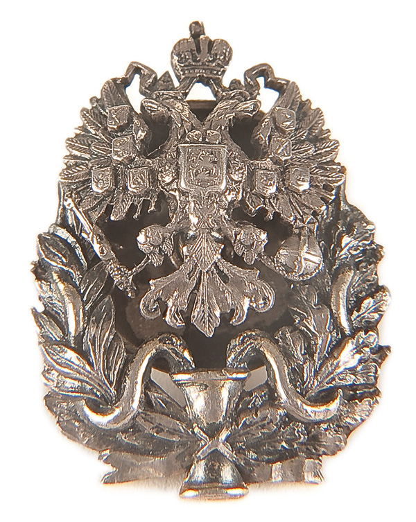 A RUSSIAN SILVER MINIATURE BADGE OF MEDICAL OFFICERS. Awarded for Doctors Degree, hallmarked St. Petersburg 1908-1917, Cyrillic maker's mark V.D. and 84 standard. Length 1 inch (2.5 cm).