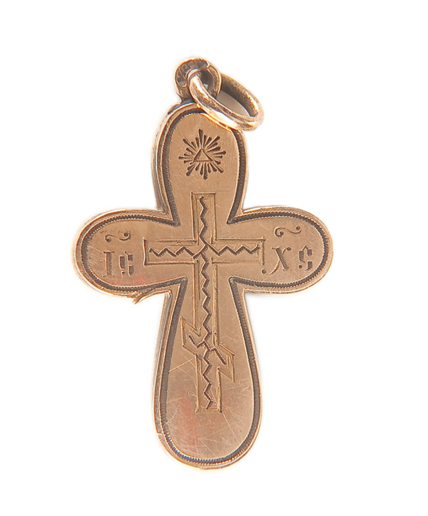 A RUSSIAN GOLD RELIQUARY CROSS, 19TH CENTURY. With engraved crucifix with hinged cover opening to reveal a hollowed interior, indistinguishable hallmarks, 56 gold standard. Length 1.25 inches (3 cm).