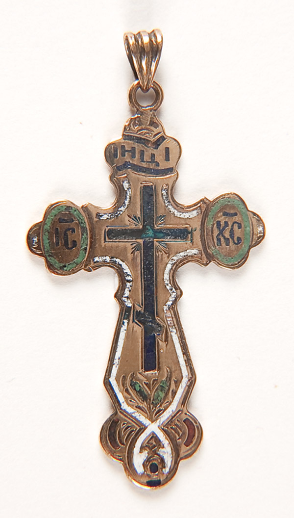 A RUSSIAN GOLD AND ENAMELED BAPTISMAL CROSS, ST. PETERSBURG 1880. 56 gold standard and Cyrillic maker's mark K.B. Length 1.75 inches (4.5 cm).