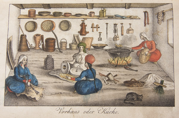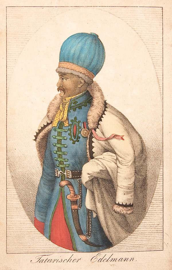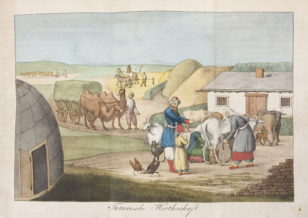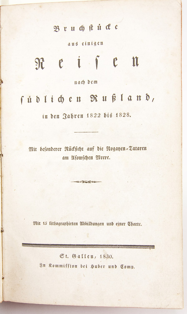 SCHLATTER, DANIEL (1791-1870) Bruchstucke aus einigen Reisen nach dem sudlichen Russland, in den Jahren 1822 bis 1828. Mit besonderer Rucksickt auf die Nogaijen-Tartaren am Asowschen Meere. First Edition St. Gallen & Bern, Huber & Comp 1830. 8 volumes. Original boards covered with marbled paper, with a gilt label on spine. Contains 11 hand colored lithograph plates including hand colored lithographed title, one folding and 9 other full-page hand colored lithographed plates. A rare first edition of the unique travel account by the Swiss missionary Daniel Schlatter (1791-1870) from St. Gall. Schlatter made three voyages to southern Russia and to the north coast of the Sea of Azov. The lithographs show Tartar costumes, habitations and both Tartar and Turkish writing. The book is dedicated to Tartar Ali-Ametow and his son Abdullah. The preface is dated St. Gallen, August 1829. The three voyages are described: -First voyage: from Switzerland via London, Berlin, St. Petersburg, and Moscow to southern Russia; back via Odessa, Lemberg, Vienna, Salzburg and Innsbruck (p. 1-44). -Second voyage: from Switzerland, via Bavaria, Saxony, Cracow and Odessa to the Sea of Azov; back via Odessa, Constantinople, Smyrna, Mediterranean, Livorno, Florence, Milano, Como and Splugenpass. With trips to Odessa and the Crimea in 1825-6 (p. 45-418). -Third voyage: from Switzerland, via London, Brussels, Cassel, Berlin, Dantzig, Warsaw and Odessa to the Sea of Azov; back via Odessa, Lemberg, Brunn, Vienna, Salzburg and Innsbruck (419-75).-Appendix: Privileges of the Mennonites in Russia (p. 476-81). -Survey of the German, Bulgarian and Jewish colonies in the area (p. 482-90). -Annotations to the map (p. 491-6)-map absent, and list of plates. Overall good condition, some very light toning, and some wear to leather spine. Bold colored hand colored lithograph plates. Interior of back cover exhibits vintage АНТИКВАРИАТ label. 8.25 x 5.25 inches (20.8 x 13.1cm)