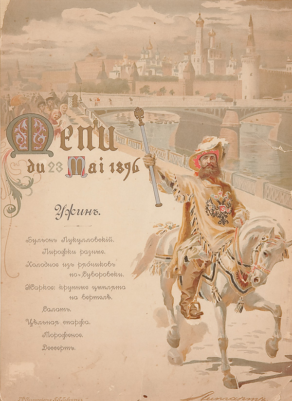 AN IMPERIAL RUSSIAN CORONATION MENU OF TSAR NICHOLAS II. Uzhin. Menu du 23 Mai 1896. [Dinner. 23 May 1896]. In Russian. Moscow: A.A. Levenson, 1896. Chromolithograph after Baron Ernst Karlovich Lipgart (1848-1932) printed in gold, silver and various colours and contained in a glazed gilt-wood frame. 13.5 inches x 10 inches (34.4 x 25.5cm).