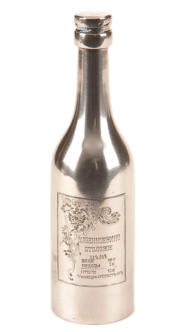 A RUSSIAN SILVER TROMPE L'OEIL WINE BOTTLE, MOSCOW, 1899-1908. The silver bottle form engraved with a faux label and friction fit stopper. Hallmarked Moscow, circa 1899-1908, Cyrillic makers mark ФИ probably for Fedor Ivanov, and with 84 silver standard. Height 6.5 inches (16.6cm).