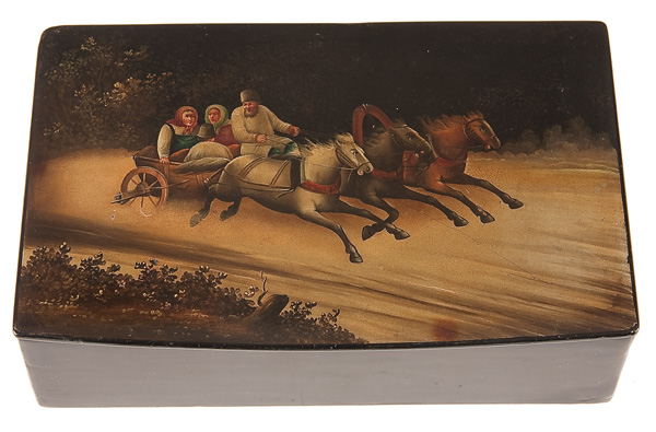 A RUSSIAN LACQUER TEA CADDY, 19TH CENTURY the hinged lid painted with a troika scene, the interior lined in tin and with a faint maker's mark, probably Vishnyakov. Length 6.75 inches (17.5 cm ), Height 2 inches (5 cm)