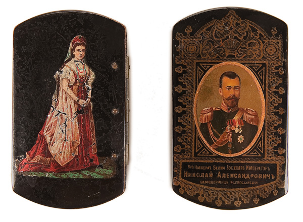 A PAIR OF RUSSIAN LACQUERWARE SNUFF BOXES, 19TH CENTURY The hinged lid of one with transfer image depicting Empress Alexandra Fedorovna, the other with the Emperor Tsar Nicholas II. Both 4 inches (10.2 cm)