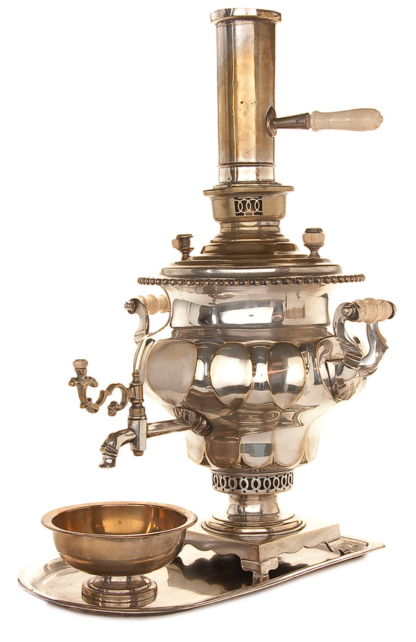 A LARGE AND IMPRESSIVE RUSSIAN SILVER PLATED SAMOVAR, 19TH CENTURY the bulbous urn form resting on a platform raised on four corner legs with applied scroll and ivory carved handles, together with ivory handled chimney, waste bowl and undertray. Indistinguishable maker's mark beneath Imperial warrant. Overall height with chimney 26.25 inches (66 cm)