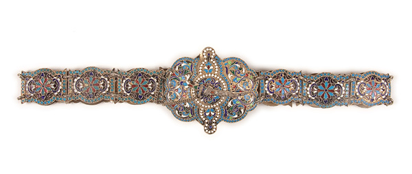 A RUSSIAN SILVER GILT AND CLOISONNE ENAMELED WOMEN’S BELT. Hallmarked Moscow 1899-1908 and with Cyrillic maker's mark 'IZ' for Ivan Zakharov. Overall length 27.25 inches (69 cm), comes with an additional 1.3 inch link.