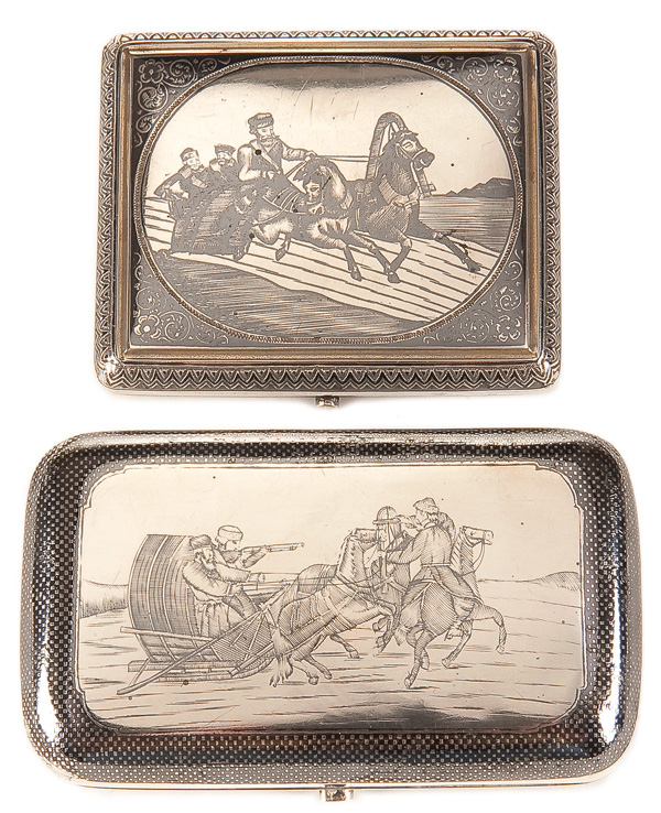 A PAIR OF RUSSIAN SILVER AND NIELLOED CIGARETTE CASES, MOSCOW, The first with hinged lid nielloed with winter troika scene and the verso with scrolling foliage and a central medallion, Moscow, dated1889 and with indistinguishabe maker's mark and 84 standard. 3.5 inches x 3 inches (9 x 7.5 cm), 4.5 inches x 2.5 inches (11.2 x 6.5 cm) The second of rectangular form with rounded corners, overal nielloed with checkerboard pattern, the hinged lid nielloed with a troika being attacked by a bandit, Moscow, dated 1881, Cyrillic maker's mark 'PA' and 84 standard. Length 4.3 inches (11 cm)