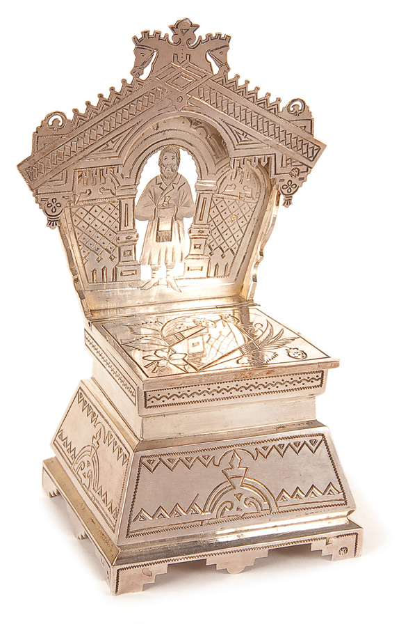 AN FINE RUSSIAN ENGRAVED SILVER SALT CHAIR, MOSCOW, 1891 The backrest engraved in the Slavic style and depicting a peasant holding bread and salt. The hinged lid opening to reveal a gilded interior. Hallmarked Moscw, dated 1891 and Cyrillic maker's mark 'VAHeight 5.5 inches (14 cm), height 4.75 inches (12 cm)