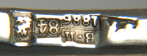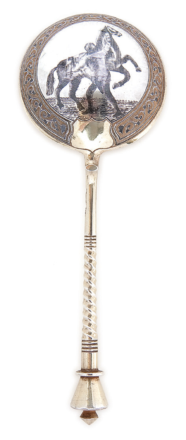 A RUSSIAN SILVER GILT AND NIELLO SPOON the bowl nielloed with a man holding a rearing horse. The gilded bowl set with twist handle, hallmarked Moscow, dated 1886, with 84 standard and indistinguishabel maker's mark. Length 6.75 inches (17 cm)