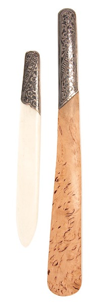 A PAIR OF RUSSIAN SILVER AND NIELLO MOUNTED PAPER KNIVES, CIRCA 1900 comprising of an ivory blade set in nielloed handle and a Karelian birch blade set in a similar handle. Greatest length 12.5 inches (32 cm)