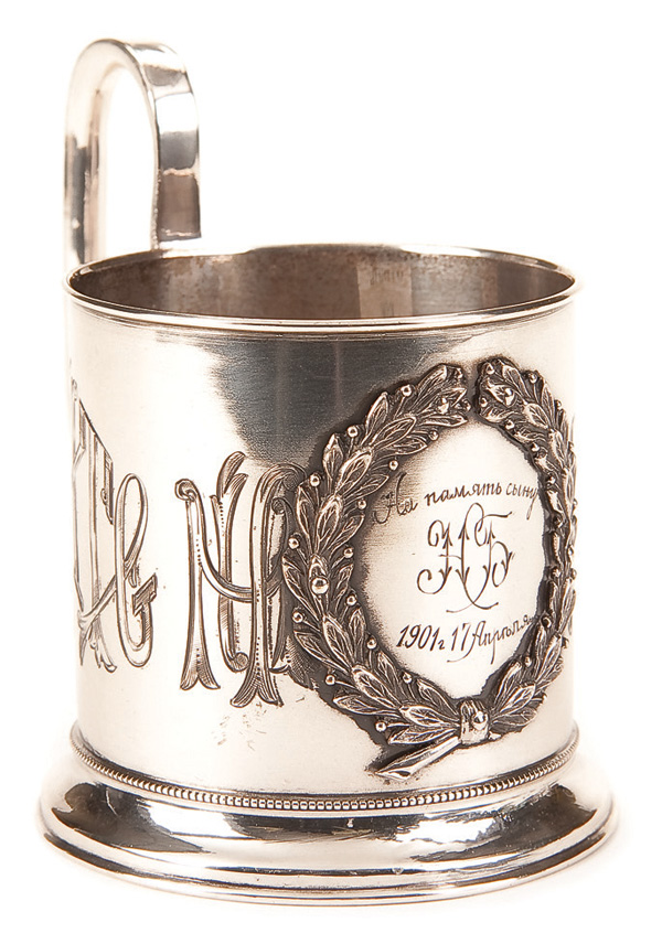 A RUSSIAN SILVER PRESENTATION TEA GLASS HOLDER, MOSCOW, 1899-1908. Resting on a slightly flared rim with beaded border. The sides engraved in Russian, 'Drink to Your Health'. The front set with a laurel wreath and engraved within, 'To Our Son N.B. in Memory, 17 August 1901', and with large scroll handle. Hallmarked Moscow 1899-1908, Cyrillic makers mark ?? for Fedor Gorbunov, and with 84 silver standard. Height 4.25 inches (10.5cm).