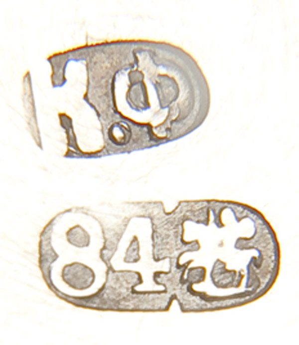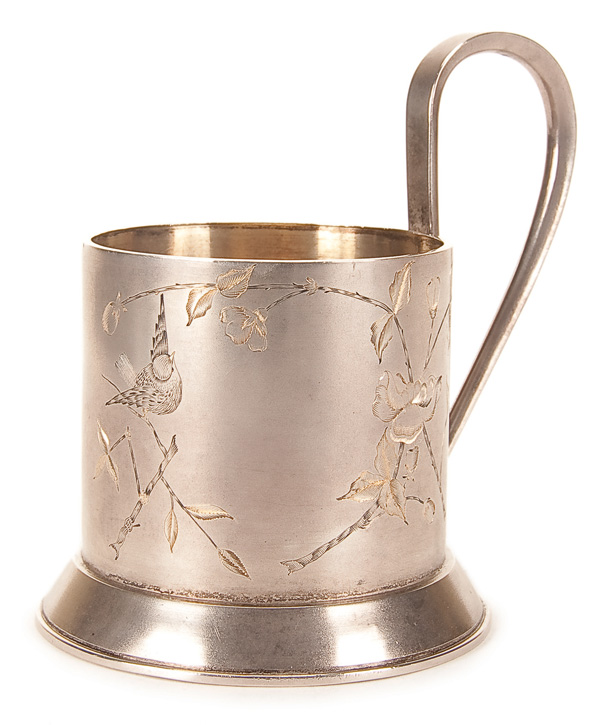 A RUSSIAN SILVER TEA GLASS HOLDER, The sides engraved with floral sprigs and a song bird and with applied hook handle. Hallmarked Moscow, circa 1880 and with Cyrillic maker's mark 'KF' and 84 standard. Height 4.5 inches (11.5 cm).