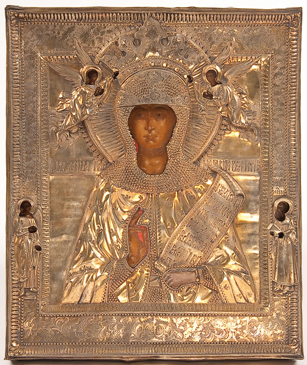 A RUSSIAN ICON OF ST. PARASKEVA, CIRCA 1800. Two angels place a matryr's crown upon her, as she delivers a blessing and holds a scroll inscribed with the beginning of the Nicean Creed. The border with the Guardian Angel (left) and St. Paul the Bishop. Overlaid with a gilded repousse metal riza. 12.25 inches x 10.5 inches (31 x 26.5 cm).