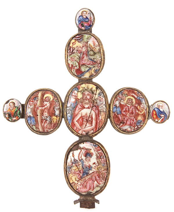 AN ENAMELED COMPOSITE PASSION CROSS, 18TH CENTURY, PROBABLY ROSTOV. Comprising five enameled oval medallions depicting scenes from the Passion of Christ. Three of the outer terminals mounted with later enameled medallions of Apostles. 6.75 inches x 5.75 inches (17.4 x 14.5 cm).