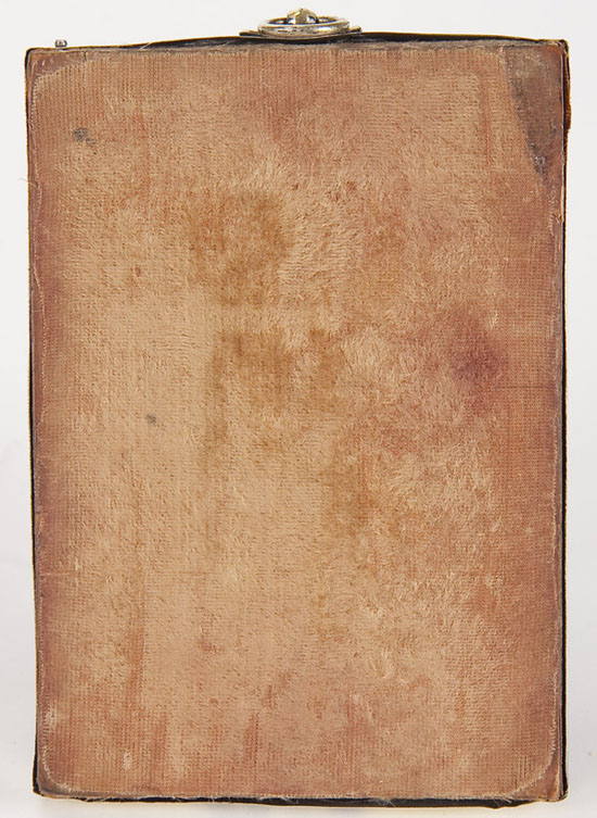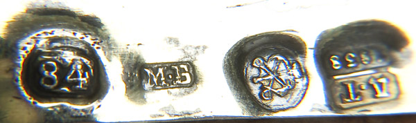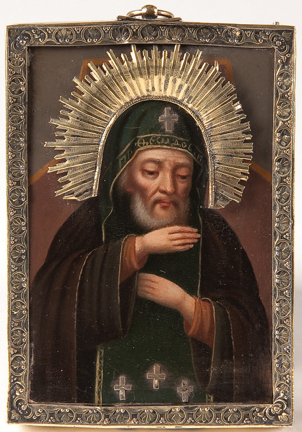 A RUSSIAN ICON OF SAINT THEODOSIUS OF TOTMA, circa 1840. Here the venerable old monk is depicted in death. He wears the Great Skema, a monastic robe and along the border of his hood is embroidered 'The Venerable Feodosiy' The icon is held in a silver-gilt and repousse frame and silver-gilt crosses and a halo are applied directly to the icon. The frame is hallmarked Saint Petersburg, dated 1838, with silver standard 84 and Cyrillic makers mark M.B. for Mikhail Borodulin, a silversmith active in St. Petersburg from 1836-1849. 4.25 inches x 3 inches (11cm x 7.6cm).