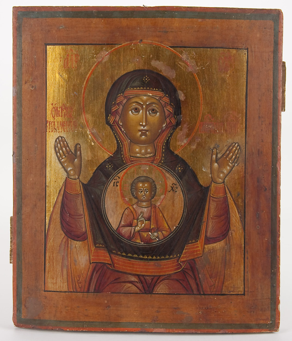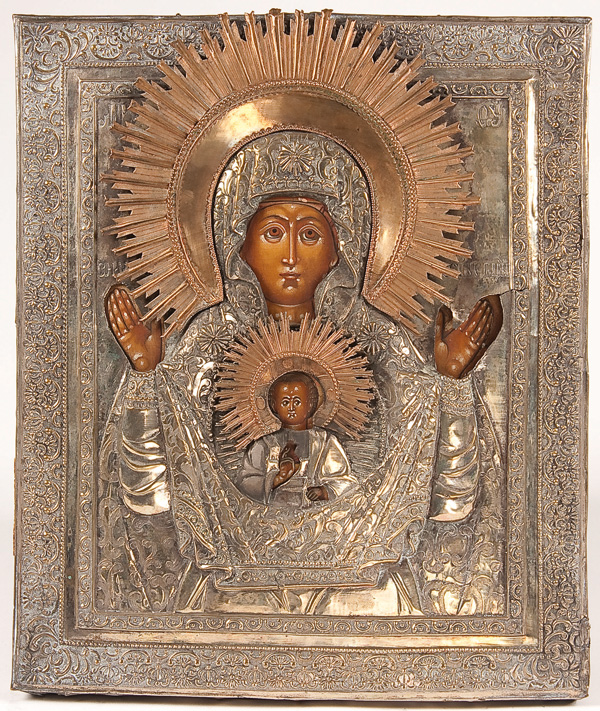 A RUSSIAN ICON OF THE SIGN MOTHER OF GOD, 19TH CENTURY. Following the traditional canons and overlaid with a respoussed silvered riza. 12.5 inches x 10.75 inches (31.5 x 27 cm).