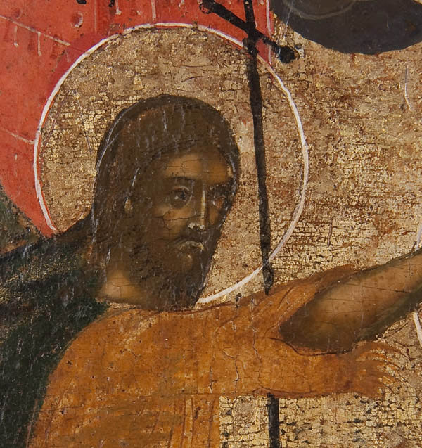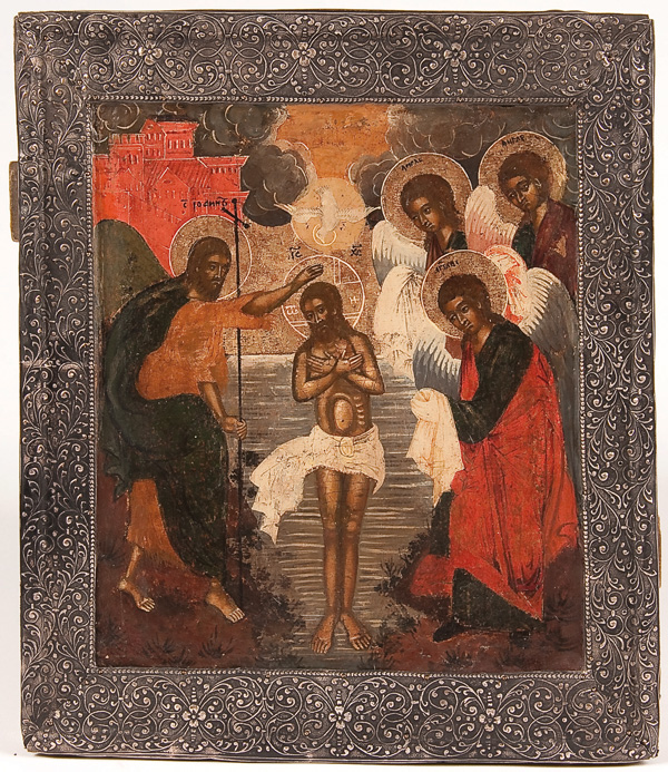 A RUSSIAN ICON OF THE BAPTISM OF CHRIST, 18TH CENTURY. The borders overlaid with later silver repousse basma. 12.5 inches x 10.75 inches (31.5 x 27.5 cm).