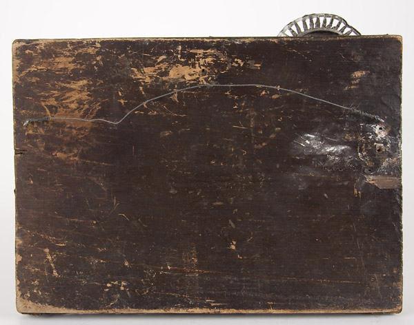 A RUSSIAN ICON OF ST. ANTONIY RIMLYANIN. Overlaid with a 19th century silvered repoussed copper riza. The painted image later. 10.5 inches x 13.25 inches (26.7 x 45 cm).