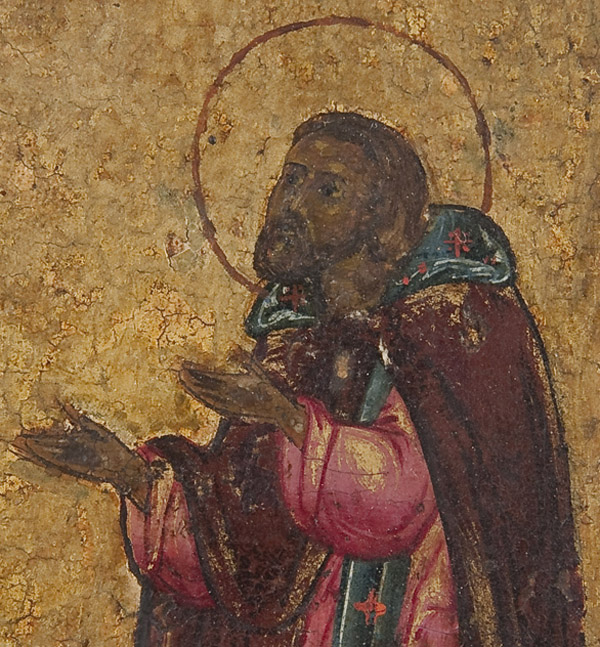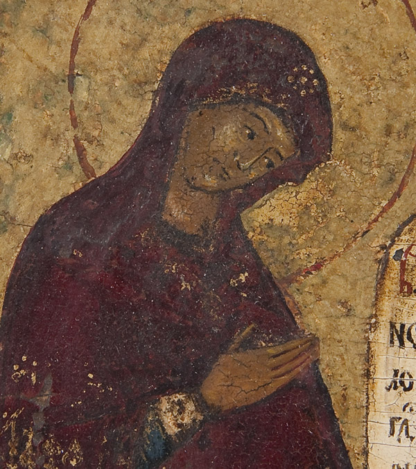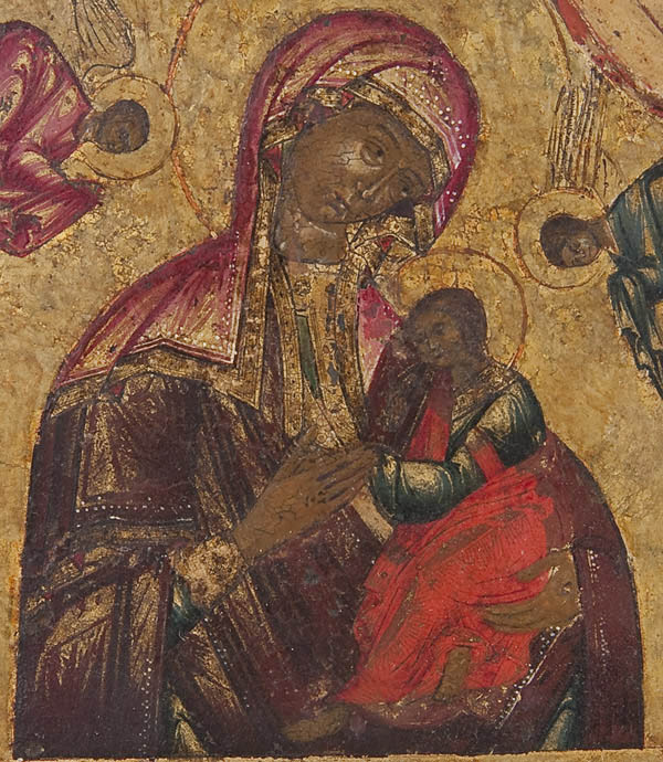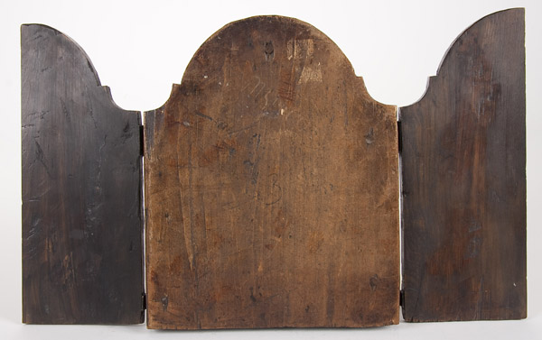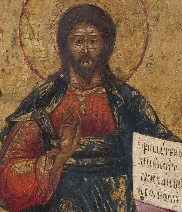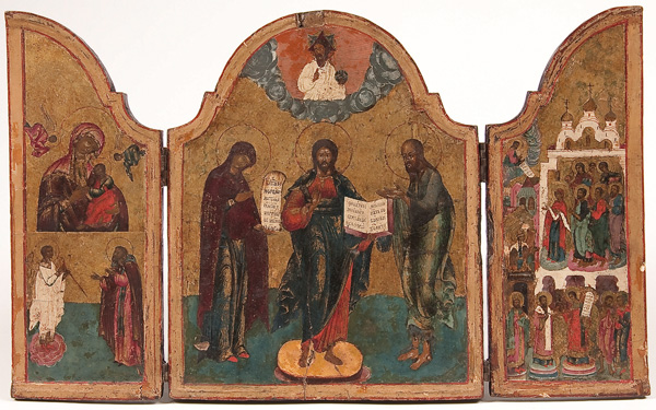 A RUSSIAN ICON TRIPTYCH, 18TH CENTURY. The center panel with the Deisis, the left wing with the Mother of God of the Passion (top) and below the Guardian Angel and a monastic saint. The right wing with the Pokrov Mother of God. 10.75 inches x 18 inches (27.4 x 45.5 cm).