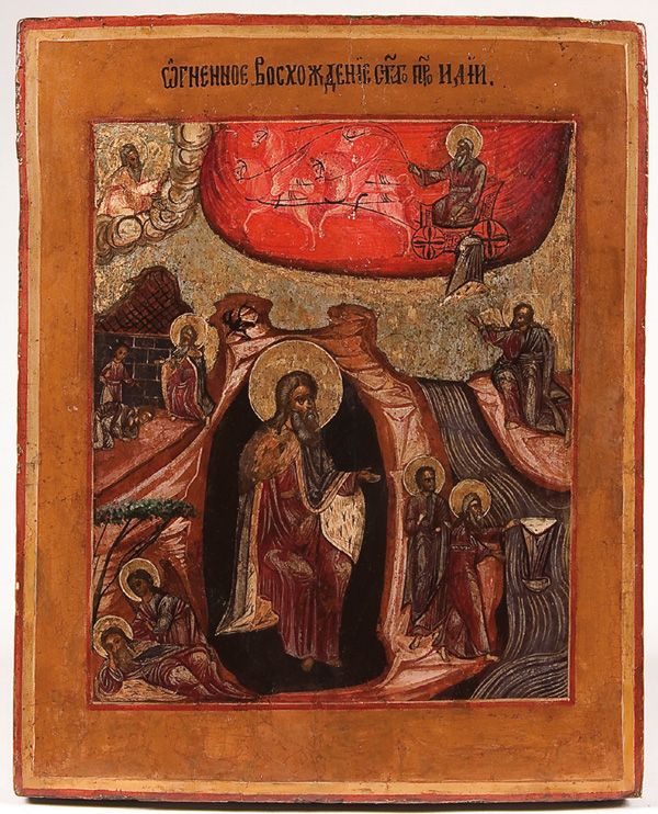A RUSSIAN ICON OF THE FIERY ASCENSION OF THE PROPHET ELIJAH, 19TH CENTURY. With scattered strengthening and touch-ups. 14.5 inches x 11.75 inches (37 x 30 cm).