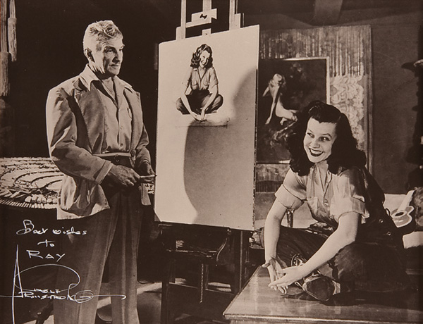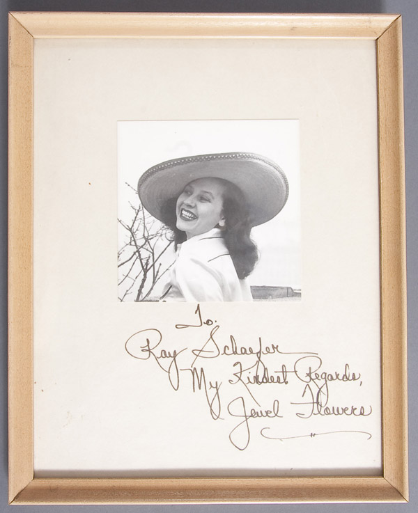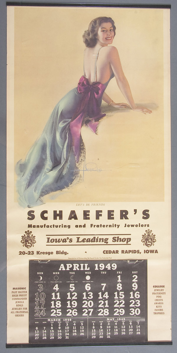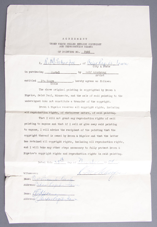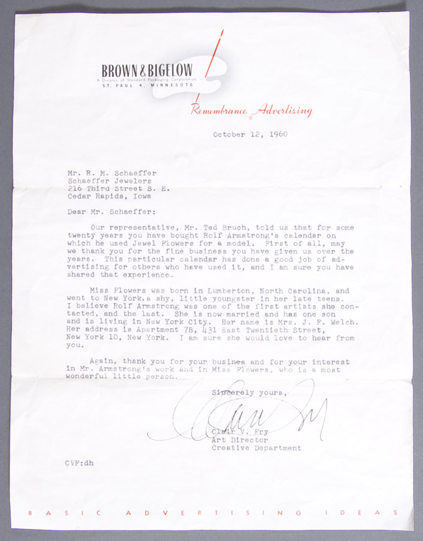 The offered lot includes original purchase agreement from Brown & Bigelow to Mr. Schaefer, dated December 28, 1954. Lot further includes an original letter from Brown & Bigelow to Mr. Schaefer regarding the sitter, Miss Jewel Flowers Evans, dated October 12, 1960. Plus a copy of Miss Flowers obituary, a photograph of Miss Flowers with a personal dedication to Ray Schaefer, a photograph of Rolf Armstrong and Miss Flowers together with a personal dedication by artist to Ray. Also an original Rolf Armstrong calendar for Schaefer’s dated 1949 (missing January-March).