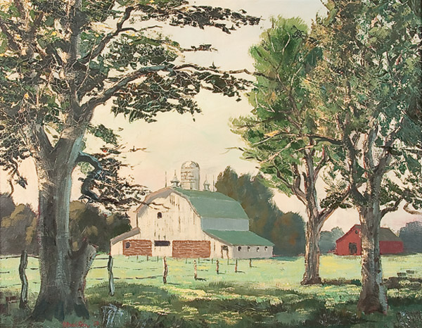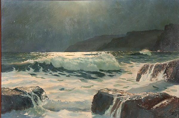 A group of four paintings including a Mountain Landscapes, two Seascapes and a White Barn