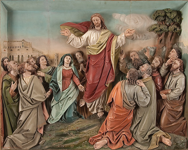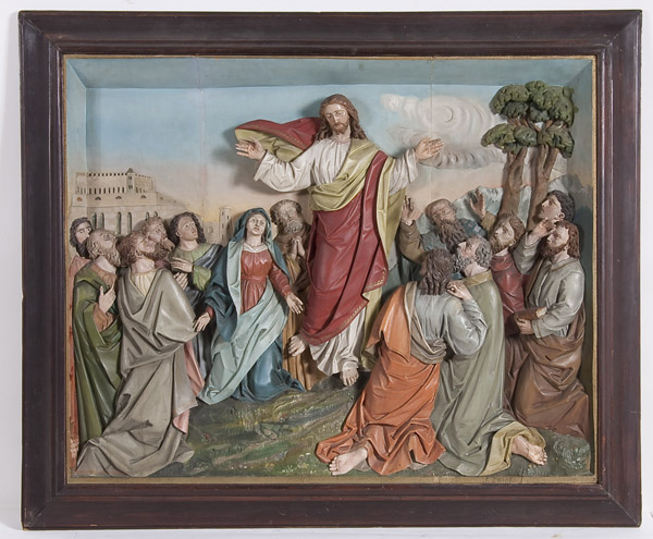 AN IMPOSING CARVED AND POLYCHROME WOOD FIGURAL GROUPING OF THE ASCENSION, 19TH CENTURY, SEBASTIAN ZWINK (1816-1906). Carved in high relief, at center the resurrected Christ ascending to heaven surrounded by the twelve Apostles and the Virgin Mary. The city walls of Jerusalem in the background. Carved with deep folds, cascading hair and good anatomy and retaining the original polychroming. Inscribed with signature lower right S. Zwink and contained in its original beveled wood frame. Excluding frame 28 inches x 35 inches (71 x 88.5 cm). With frame 34.5 inches x 40.25 inches (87.5 x 104.9 cm).