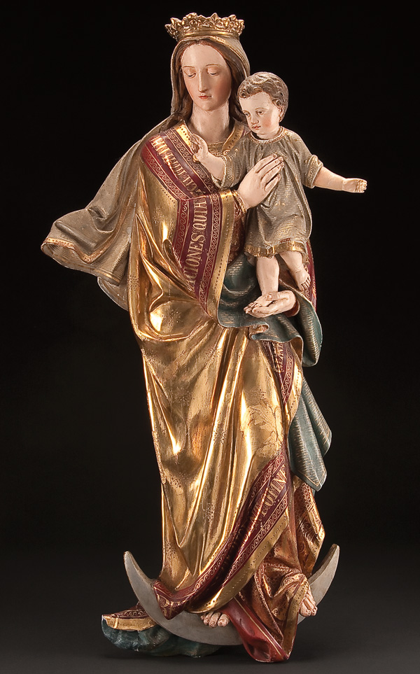 A LARGE AND IMPRESSIVE CARVED AND GILT WOOD FIGURAL GROUPING OF THE MADONNA AND CHILD, GERMAN 19TH CENTURY. Carved in half-round with flat back and sculpted with deep flowing folds, good proportions and naturalistically painted. The Virgin's garments gilded and incised and the hem banded with maroon polychrome and inscribed with gilt lettering from the first chapter of the Gospel of St. Luke. Verso set with recessed hanging device. A large and breathtaking carving. Height 36.5 inches (92.7 cm).