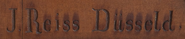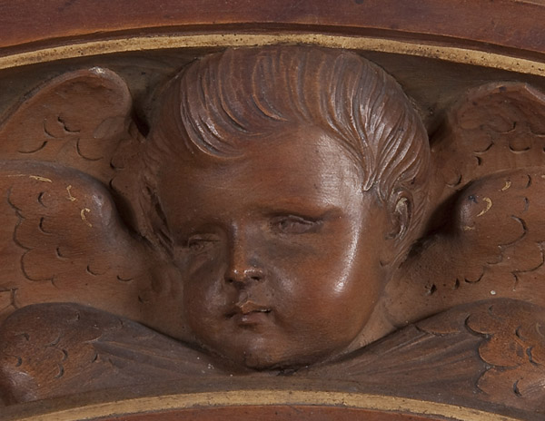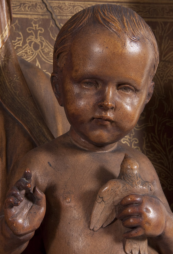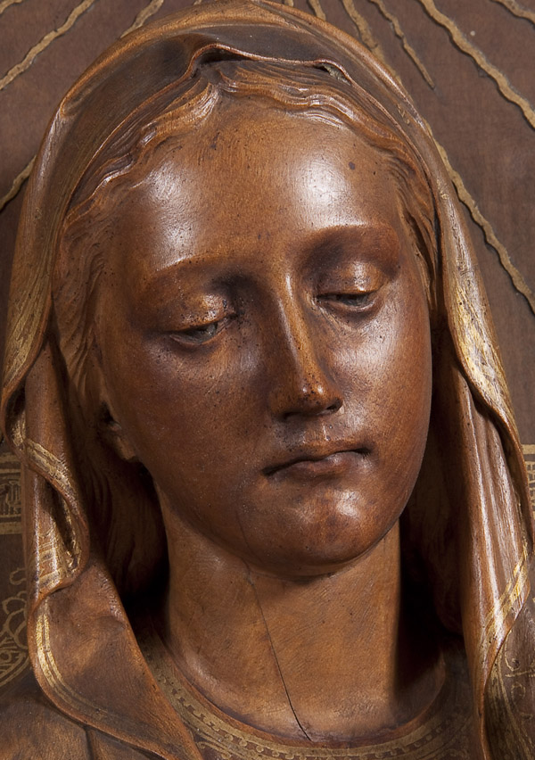 A VERY FINE AND IMPORTANT CARVED AND GILT DECORATED FIGURAL GROUPING OF THE MADONNA AND CHILD, ANTON JOSEPH REISS (1835-1900). At center, within an arched carved reserve, a three-quarters round carving of the Madonna and Child, naturalistically rendered with deep folds, good proportions and good anatomy. The infant Christ child delivers a blessing while holding a small sparrow, and the hem of the Virgin's vestments with gilt decoration. The carved arched niche with acanthus bracketed based pillasters on both sides supporting an arched top deeply carved with cherubim. Above the Virgin a carved dove, symbolizing the Holy Spirit, set against a gilt sunburst decoration and below further still the background in ornate gilt decorated scrolling foliage. The skirt carved with a fruit basket flanked by stylized dolphins. Verso with recessed hanging hardware and with faded exhibition label inscribed Reiss and the base with incised signature 'J. Reiss-Dusseld.' Stunning! Height 37.5 inches (95.3 cm), width 20.75 inches (52.5 cm).