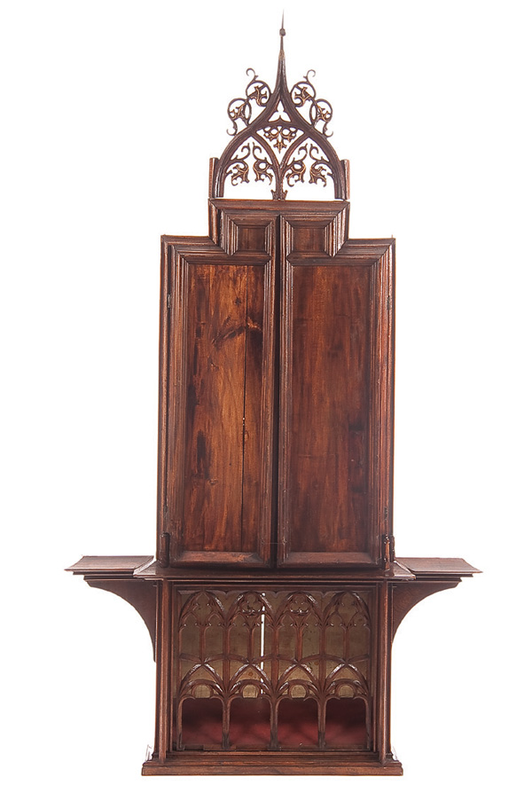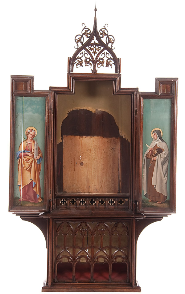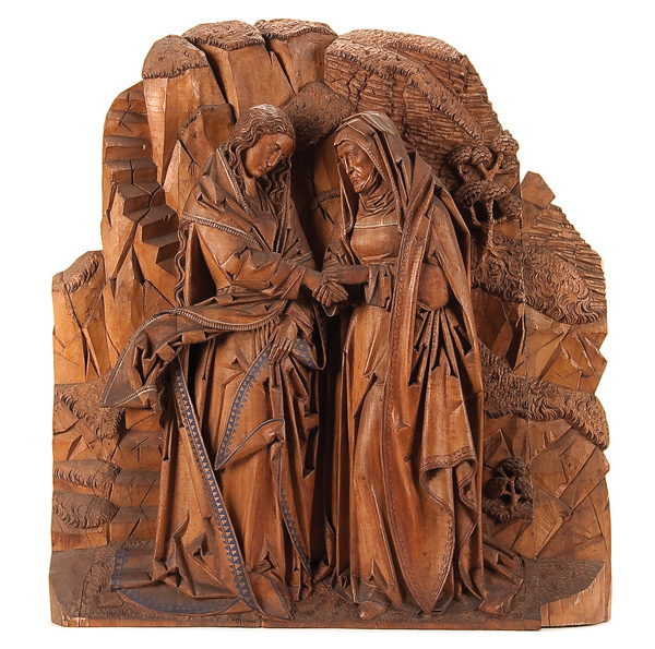 A LARGE AND IMPRESSIVE CARVED GOTHIC STYLE TRIPTYCH OF THE VISITATION, GERMAN 19TH CENTURY. The ornate base with carved openwork Gothic style arched elements supporting a larger central triptych opening to reveal, at the center, an exceptionally carved wood figure of the Visitation in the Neo-Gothic taste (illustrated), sculpted in high relief with excellent detailing. The left and right interior wings painted with Saints Barbara (left) and Saint Ursula (right). The top with carved Gothic style arch finial. The carved figural grouping 27 inches (69 cm), height 24.5 inches (62.2 cm) width. Overall height 88 inches (223.5cm) Width 49 inches (125cm) open