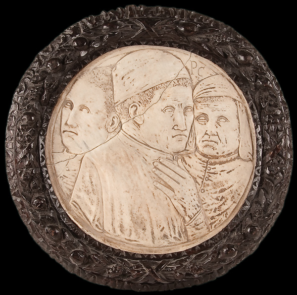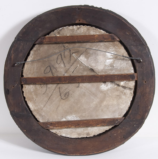 A CARVED RELIEF MARBLE PLAQUE IN THE RENAISSANCE STYLE, PROBABLY VICTORIAN 1825-1875. Depicting a gathering of men and contained in a round carved wood frame of banded fruits and flowers. Diameter 21 inches (53.4 cm).