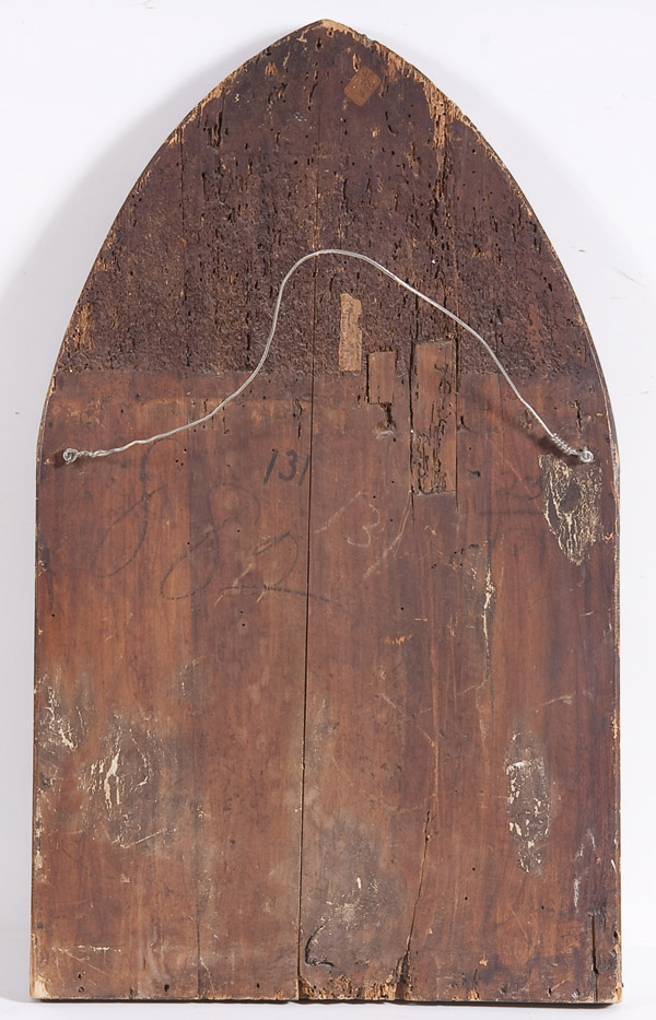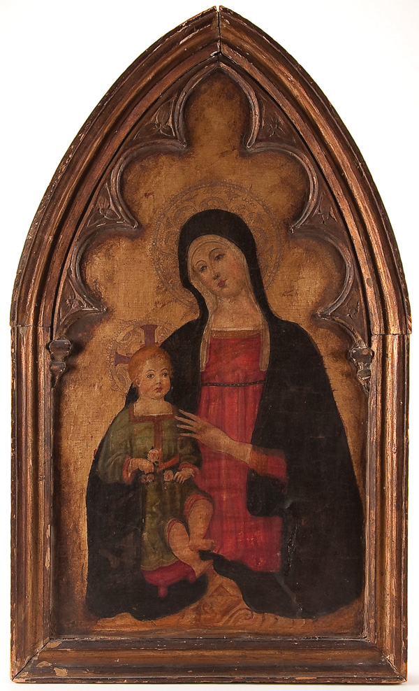 A SIENNESE STYLE PAINTING, PROBABLY 19TH CENTURY. Depicting the Madonna and Child within a carved gilt wood Gothic arched frame. Overall 35 inches x 21 inches (88.8 x 53.1 cm).