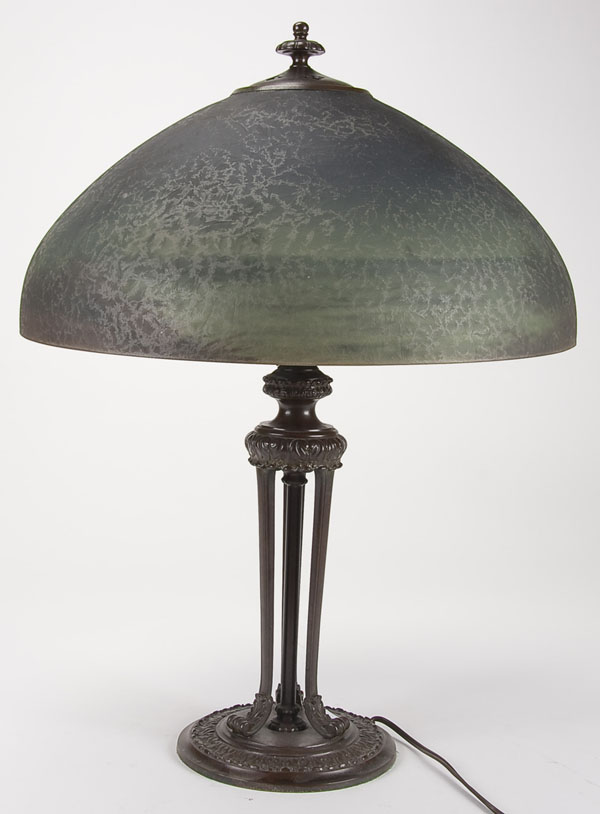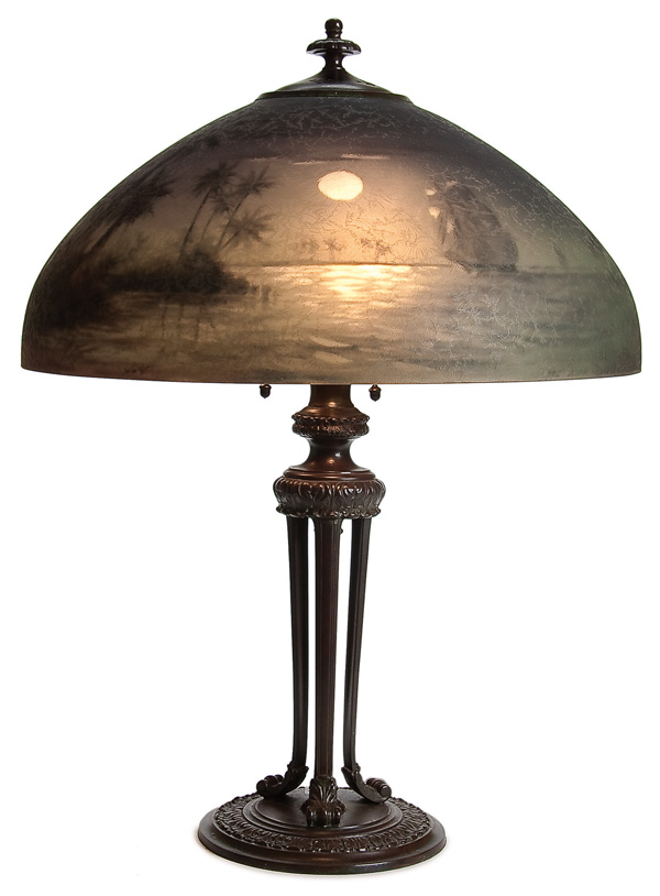 A FINE HANDEL 'TREASURE ISLAND' REVERSE PAINTED GLASS TABLE LAMP, CIRCA 1915. The domical shade with embossed texture finely enameled with a tropical scene of a pirate ship in island harbor. Displayed on a bronzed metal base. The shade signed Handel #6391 and artist signed 'B. Parlow', the base with affixed cloth tag. Diameter 18 inches (46 cm), height 24 inches (61 cm)