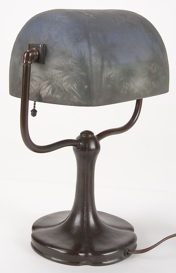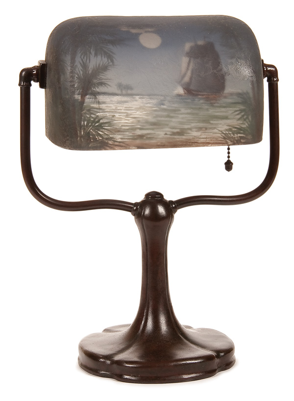 A GOOD HANDEL 'TREASURE ISLAND' REVERSE PAINTED DESK LAMP, CIRCA 1915. The domed rectangular shade with embossed texture depicting a moonlit tropical pirate ship on obvserse and a distant second ship on reverse contained in a bronzed metal harp shape base. The shade signed 'Handel 6576'. Height 14 inches (36 cm)