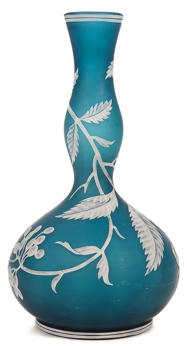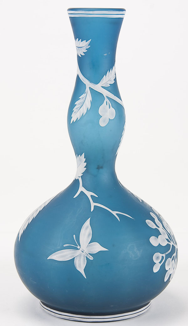 A GOOD ENGLISH CAMEO GLASS VASE, CIRCA 1900. Of bulbous bottle form in azure blue colored satin glass overlaid in opaque white, cut back and carved with large leaves and berries. The verso with a moth in flight. Height 10.25 inches (26 cm).