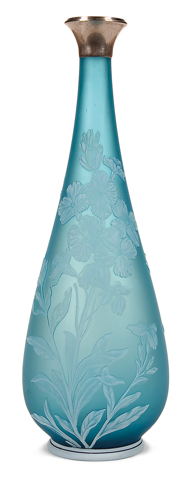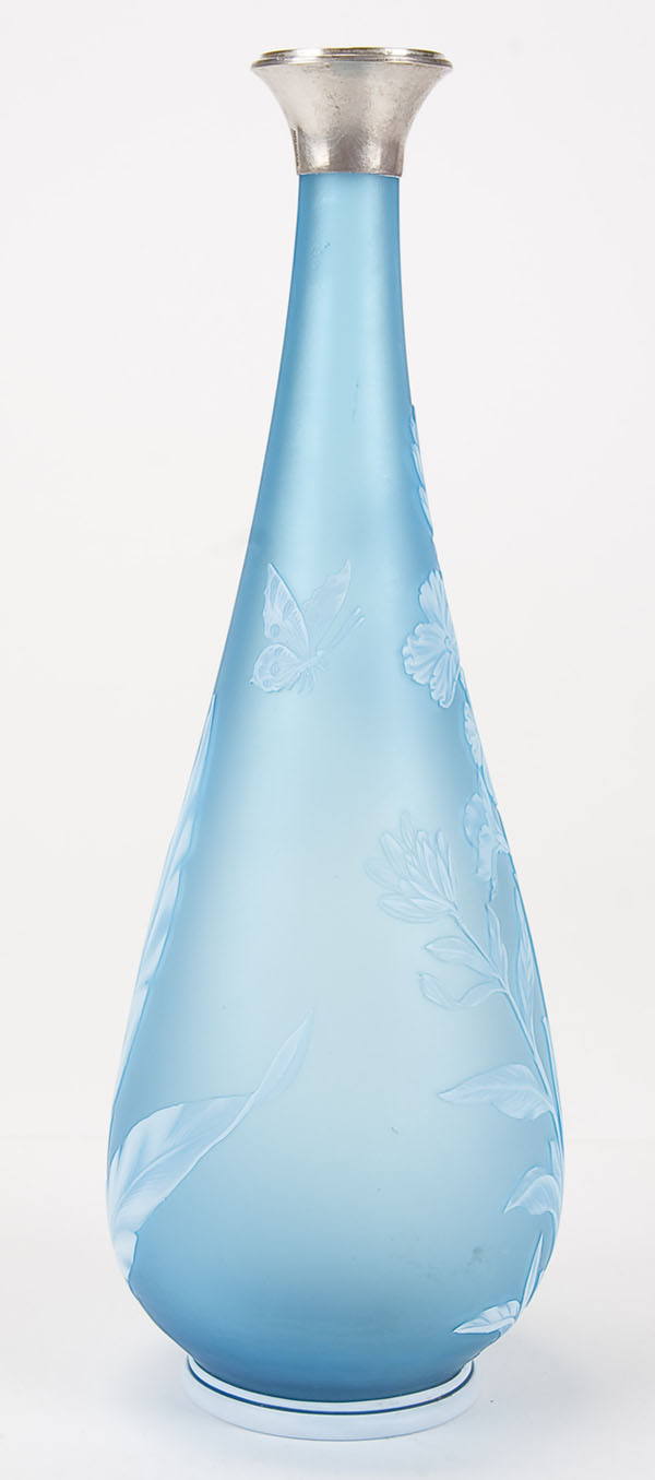 A VERY FINE WEBB FOR THEODORE STARR SILVER MOUNTED CAMEO GLASS VASE, LATE 19TH CENTURY. The baluster shape blue satin glass overlaid in white opaque cut back and expertly carved with finely sculpted floral blossoms and leaves, with a moth in flight on verso. Topped with a sterling mounted rim. The polished pontil acid etched 'Theodore B. Starr, New York'. Height 13.25 inches (34 cm).