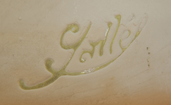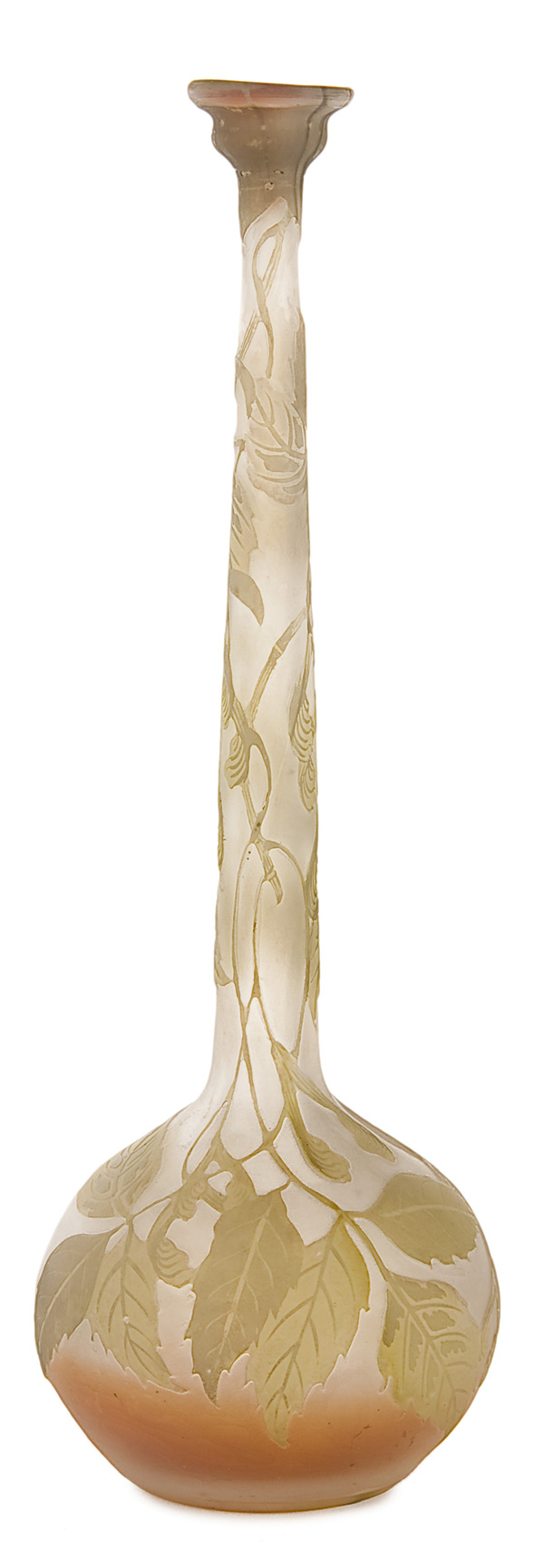 A GALLE FRENCH CAMEO GLASS BUD VASE, CIRCA 1900. Bulbous stick form with original rim in gray shading to amber glass overlaid with shades of green cut back with seed pods and leaves. Signed in cameo 'Galle'. Height 12.25 inches (31 cm).