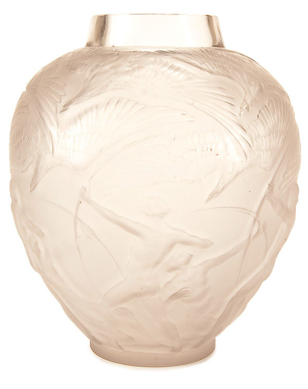 A RENE LALIQUE 'ARCHERS' MOLDED AND FROSTED GLASS VASE, INTRODUCED 1921, MARCHILHAC No. 893. With molded design of nude archers and birds in flight. Signed in script 'R. Lalique-France', minor flake inside rim. Height 10.5 inches (26.5 cm).