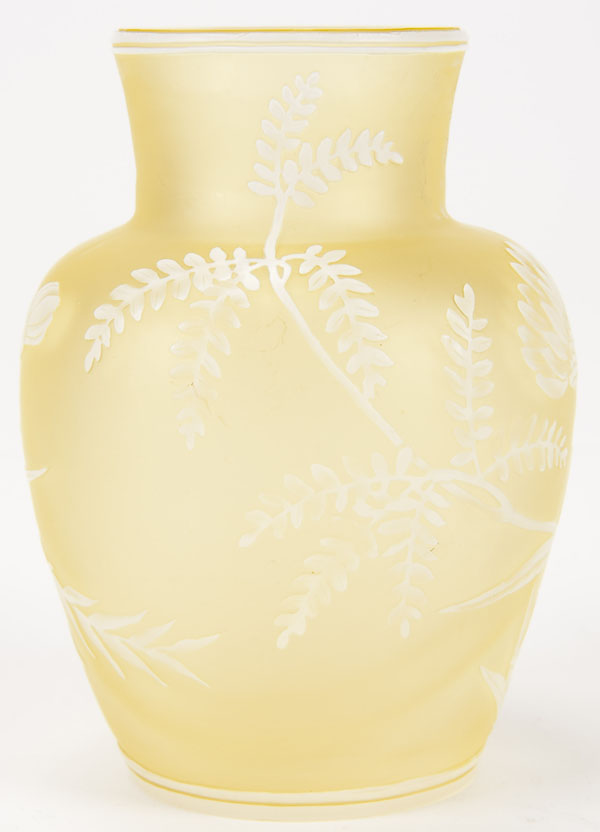 AN ENGLISH CAMEO GLASS CABINET VASE, CIRCA 1900. In citron colored satin glass overlaid in white opaque cut back and finely carved with thistle and fern decoration. Height 4.25 inches (10.5 cm).