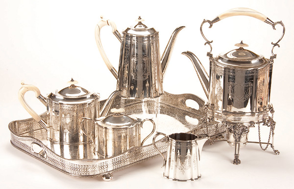 A FIVE PIECE ENGLISH STERLING COFFEE AND TEA SERVICE, LONDON 1926. Ellis Jacob Greenburg, Georgian revival with chased foliates and ivory handles comprising a tilting hot water urn, coffee pot, teapot, cream jug and covered sugar. Together with a Sheffield silvered tray with pierced gallery. The largest height 15.75 inches (40 cm), weight 149.7 troy oz.