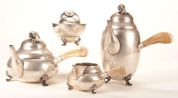 A 4-PIECE STERLING TEA SERVICE AFTER GEORG JENSEN, MID 20TH CENTURY. In the 'Blossom' style pattern with applied stylized florals and carved ivory handles. Comprising a coffee pot, teapot, cream jug and covered sugar. The largest 9.5 inches (24 cm). Marked sterling with unidentified maker's mark in beaded oval.