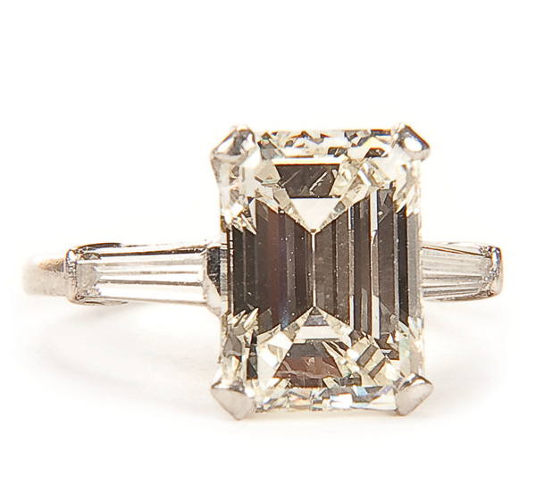 A LARGE DIAMOND AND PLATINUM RING, MID 20TH CENTURY. The approximately 4.4 ct VVSS K-L emerald cut diamond ring of very good cut set with two tapering rectangular diamonds in a stamped 10% iridium platinum mount. The diamond 8mm x 11mm, size 5.