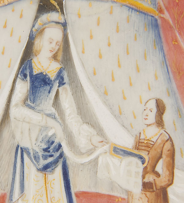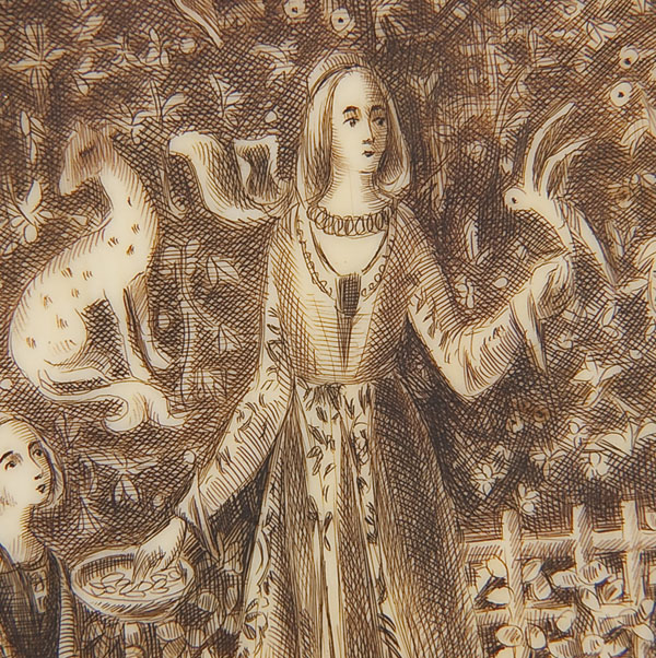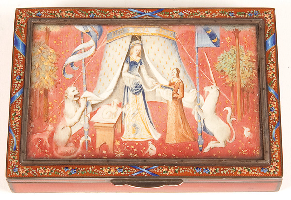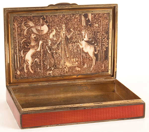A VERY FINE AUSTRIAN GUILLOCHE ENAMELED SILVER, POLYCHROME AND CARVED IVORY LIDDED BOX, CIRCA 1900. 'A Mon Seul De'sir' (The Lady and the Unicorn) after the medieval tapestry series. The inset ivory plaque with expertly painted exterior and finely engraved interior framed in a hinged guilloche floral enameled border on a guilloche enameled box. Stamped hallmarks 'Sterling' and '935'. Length 5.5 inches (14 cm), width 3.75 inches (9.5 cm)
