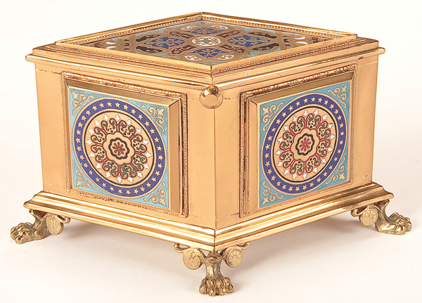A FRENCH NAPOLEON III ENAMELED BRONZE CASKET, 19TH CENTURY. Of diamond form raised on claw feet with raised panels enameled with abstract rosettes. Length 8 inches (20 cm)